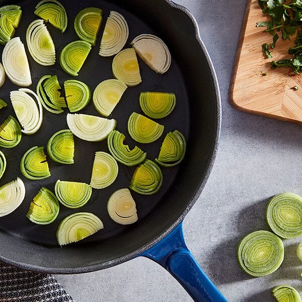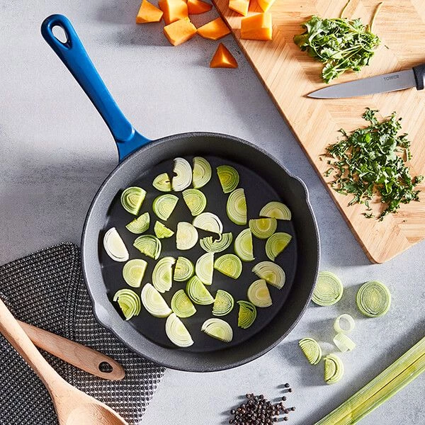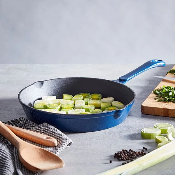 The Barbary & Oak 26cm blue round fry pan is made from durable cast iron which keeps the content hotter for longer and promotes even cooking and browning.
