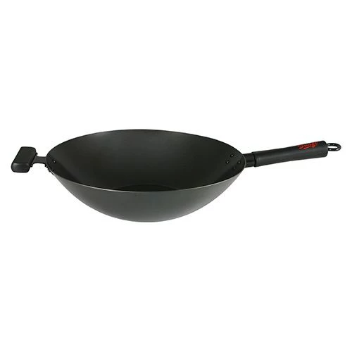 This wok is fitted with a phenolic, stay cool handle and has a helper handle for futher lifiting assistance. The flat base ensures the pan is stable on hobs and is suitable for use on all types of hob.