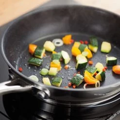 The GreenPan Infinity Thermolon ceramic non-stick enhanced with Diamonds provides a tough cooking surface with quick heating and enhanced durability without toxic fumes and made from all natural materials.