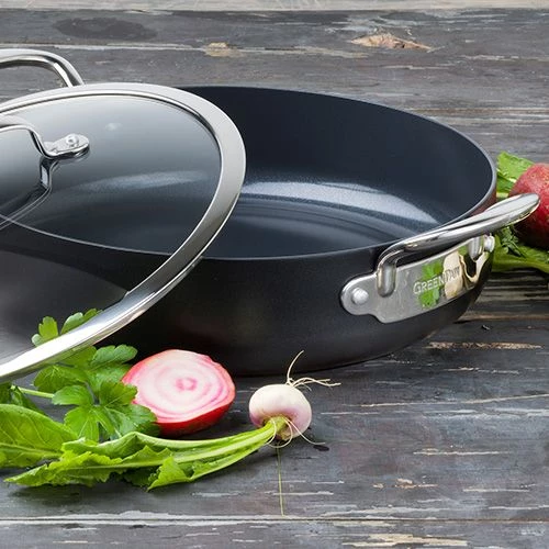 The GreenPan Infinity Thermolon ceramic non-stick enhanced with Diamonds provides a tough cooking surface with quick heating and enhanced durability without toxic fumes and made from all natural materials.