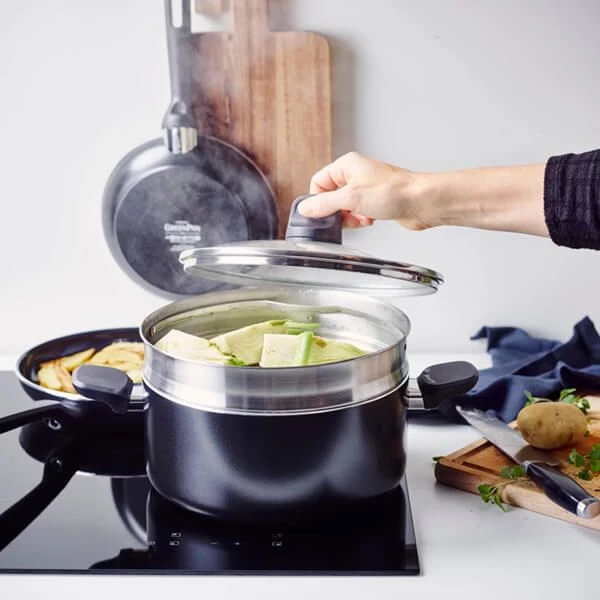 This 20 piece set includes 20cm, 24cm and 28cm frying pans, 28cm (3.9 litre) saute pan with glass lid, 20cm (3.1 litre) casserole with glass lid, 24cm (4.9 litre) casserole with glass lid, 16cm (1.6 litre) saucepan with 2 pouring spouts, 18cm (2.1 litre) saucepan with glass lid, 24cm open steamer, 2 pan protectors (27cm and 34cm), 5 utensils.