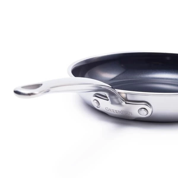 To keep this GreenPan frying pan looking like new it has an Evershine finish to protect it against heat discoloration. Wrapped rims for optimal impact protection and silhouette rivets for a snag-free interior complete the list of impressive features on this Premiere frying pan.