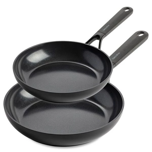 Dedicated to making smarter, better cookware for everyone, GreenPan has created the Smart Shape Collection, part of which is this GreenPan Smart Shape Aluminium Non-Stick 20cm & 28cm Frying Pan Set. This sleek black collection brings together Greenpan’s latest innovations – a seamless look and feel thanks to the rivetless V-shaped handle, a stackable design for easy, space saving storage, and their most advanced non-stick coating to provide unparalleled performance.