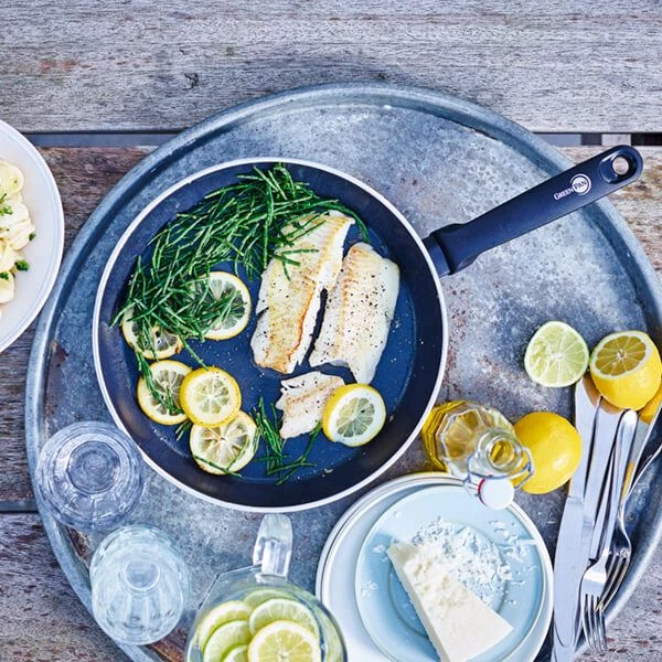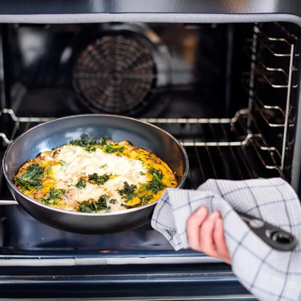 Finished with an ergonomically designed stay-cool handle, this frying pan from GreenPan is oven safe (to 180°C) and dishwasher safe, although hand washing is recommended.