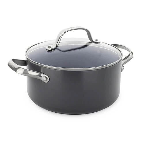 The timeless design of this GreenPan Venice Pro Hard Anodised Ceramic Non-Stick 20cm casserole with glass lid features hard anodised aluminium exterior with a thick forged base suitable for all hobs including induction.