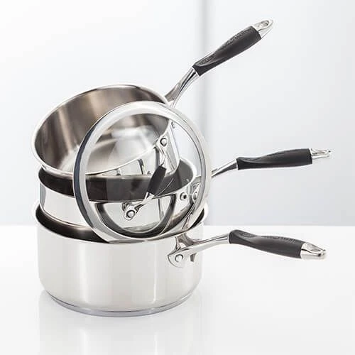 The handles of these saucepans are cast stainless steel and feature James Martin branded anti-slip silicone grips which stay cool for added safety and provide extra comfort in use.