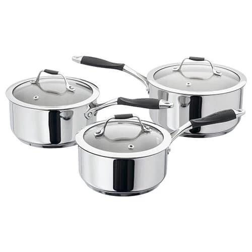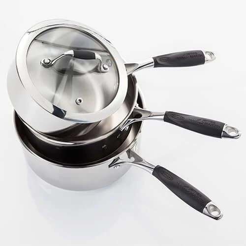 The James Martin 3 Piece Set includes a 16, 18 and 20cm Saucepan.