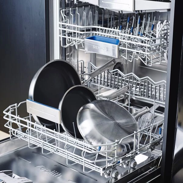 This multi-ply stainless steel non-stick cookware set from KitchenAid is dishwasher safe although hand washing is recommended for longevity.