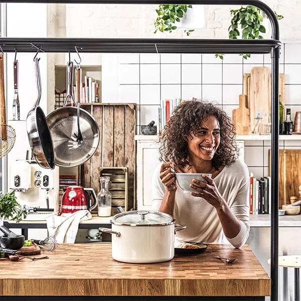 This saucepan boasts a heavy gauge steel core that guarantees excellent heat retention – perfect for long simmering soups or sauces.