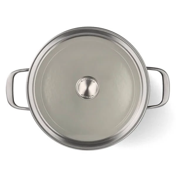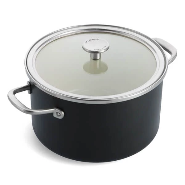 Smart features of KitchenAid steel core enamel cookware include a stainless steel rim for drip-free pouring and a tempered glass lid for easy food monitoring.