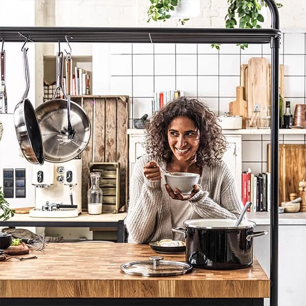 This saucepan boasts a heavy gauge steel core that guarantees excellent heat retention – perfect for long simmering soups or sauces.
