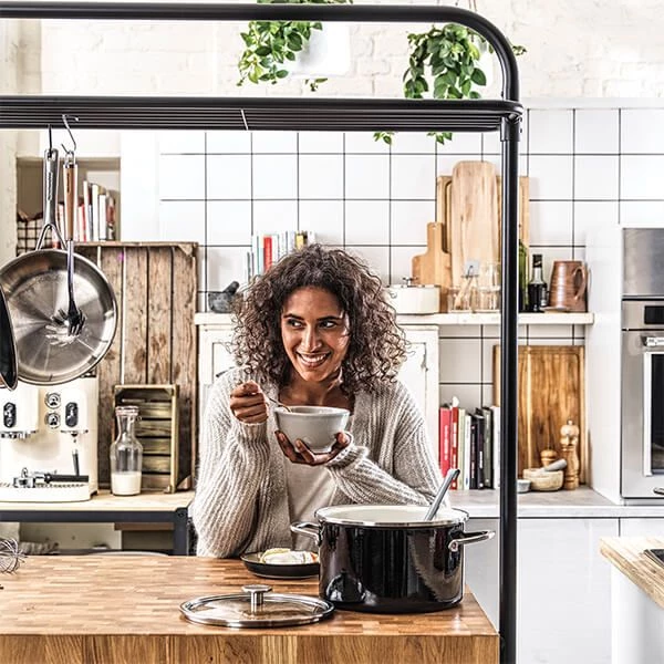 This saucepan boasts a heavy gauge steel core that guarantees excellent heat retention – perfect for long simmering soups or sauces.