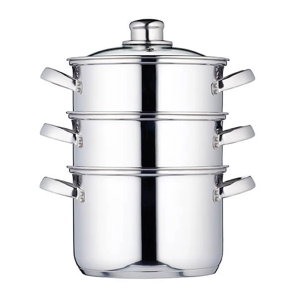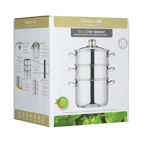 An essential item in cooking and promoting a healthy diet and lifestyle, the Kitchen Craft Three Tier Steamer is a beautifully designed piece of cookware. Steaming helps retain vitamins, minerals, flavour, colour, and texture in food, often lost when boiling and the integral three tier system allows complete flexibility for cooking different foods. Three different foods can be cooked at the same time or simply start with one tier, then add another, and then another, for phasing different cooking times according to the food type. Featuring a vented glass lid, wide riveted side handles, and high quality mirror polished stainless steel interior and exterior, the steamer is an easy and simple item to use in everyday cooking.