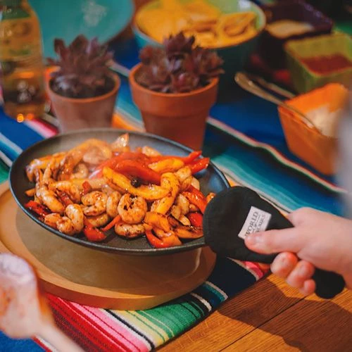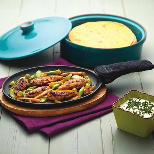 Fire up the fiesta with this beautifully designed cast iron sizzle platter, ideal for cooking and serving beef and chicken or sizzling mixed vegetables for fajitas. With a protective heat resistant wooden stand and cotton oven glove perfectly sized for the platter handle. Impress your guests with beautifully cooked Mexican food served straight to the table, introducing your friends and family to a true World of Flavours.