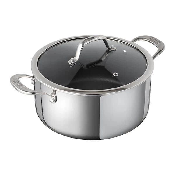 Made up of five layers: Polished Stainless Steel outer layer – ensures the pan maintains its attractive appearance and keeps it easy to clean. Aluminium layer – promotes even heat distribution throughout the base and sides of the pan. Primer layer – to support the non-stick layer making it tough and durable. Ceramic and non-stick layers – metal utensil safe.