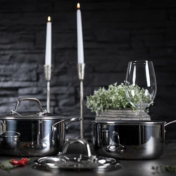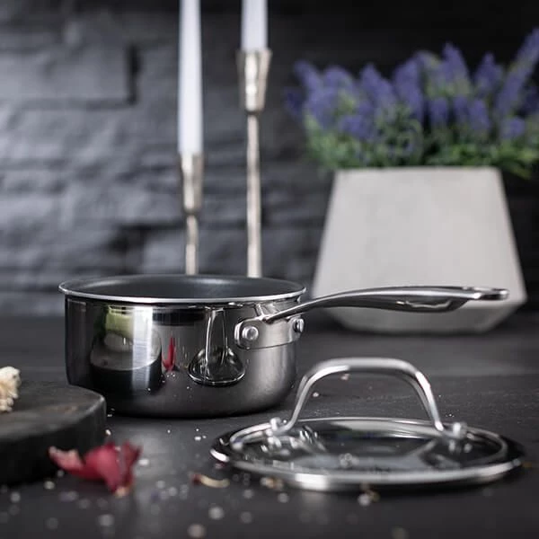 Made up of five layers: Polished Stainless Steel outer layer – ensures the pan maintains its attractive appearance and keeps it easy to clean. Aluminium layer – promotes even heat distribution throughout the base and sides of the pan. Primer layer – to support the non-stick layer making it tough and durable. Ceramic and non-stick layers – metal utensil safe.