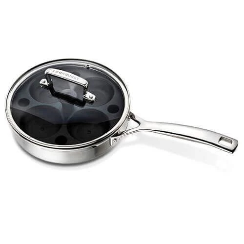 The Le Creuset 3ply stainless steel 20cm saute pan features a non-stick poaching insert for 4 eggs and a heat resistant glass lid.