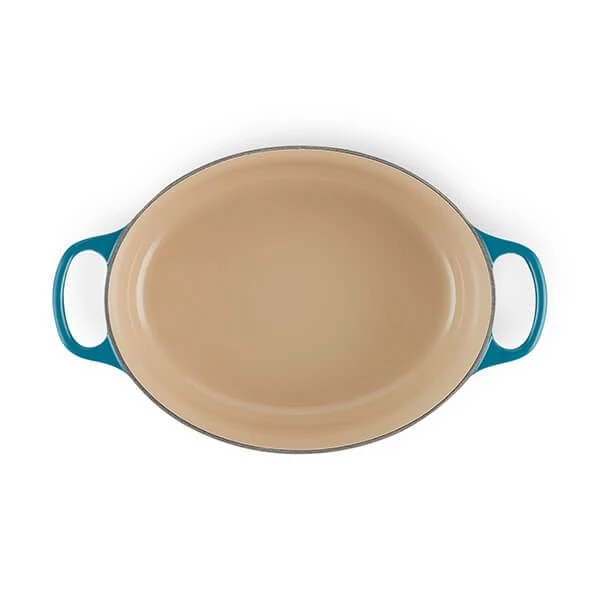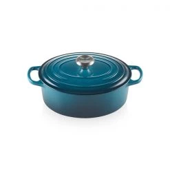 The Le Creuset Deep Teal 23cm Oval Casserole with improved easy-grip, 45% larger handles; new advanced sand interior enamel; stylish, heat resistant stainless steel knob and an enhanced tight fitting lid.