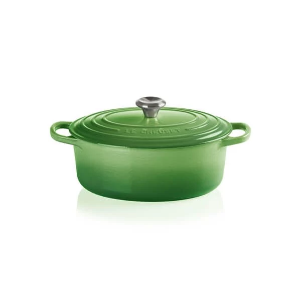 The Le Creuset Signature Cast Iron 23cm Oval Casserole in Bamboo Green is supplied with a lifetime manufacturer’s guarantee.