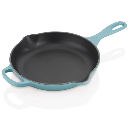 Le Creuset Cast Iron 23cm Signature Skillet, Cast iron Skillets have long been treasured kitchen staples for stovetop frying and oven baking. They are perfect for searing meat, poultry and fish, creating a browned caramelised surface and sealing in moisture. Using the pan juices to make a sauce after cooking foods like steak will give depth of flavour. Extremely versatile, they can withstand any cooking temperature, so can be used on the hob or in the oven for a vast array of cooking tasks including making fish cakes and frittata or baking a dessert for four people.