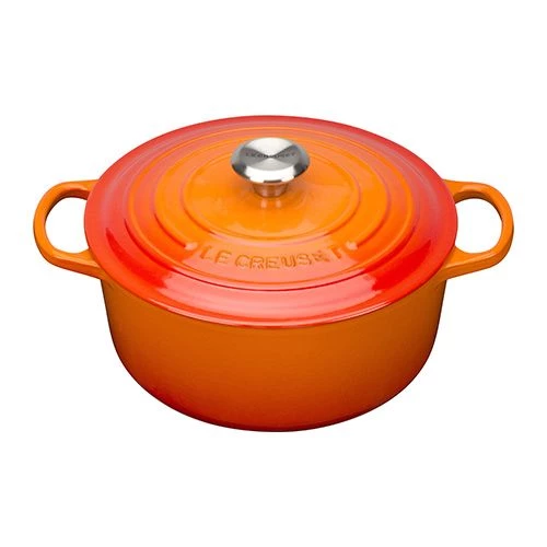 Le Creuset Signature Cast Iron Casseroles – available in round, oval and shallow buffet with improved easy-grip, 45% larger handles; advanced sand interior enamel; stylish, heat resistant stainless steel knob and an enhanced tight fitting lid.