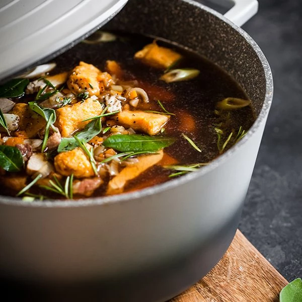 SELF-BASTING LID: Enjoy extra-succulent slow-cooked meats and rich one-pot stews, thanks to the moisture-retaining lid.
