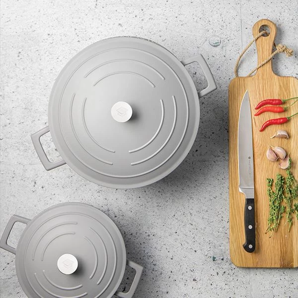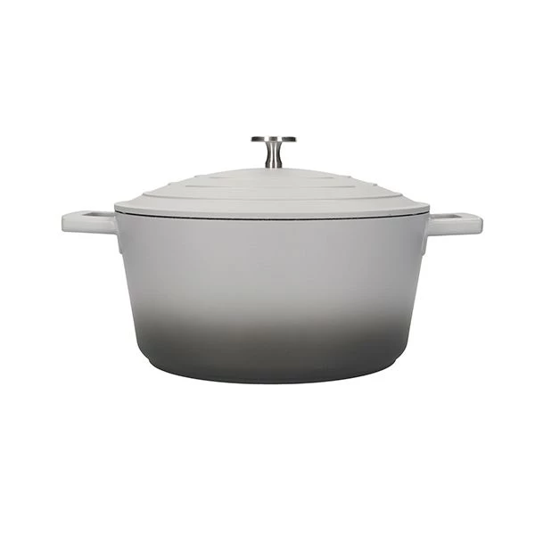 The MasterClass Grey Ombre Cast Aluminium 28cm 5L Casserole Dish, is a strong heat conductor and features a double scratch-proof, non-stick layer.