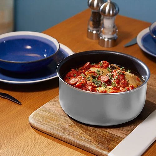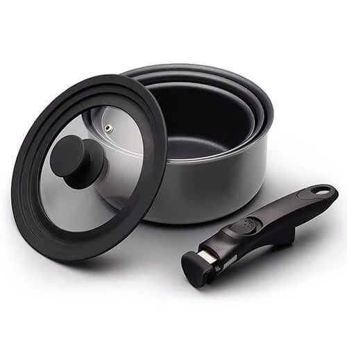 This 3 piece MasterClass Smart Space Non-Stick Induction Saucepan set includes 3 pans, a one size fits all lid and a detachable handle.