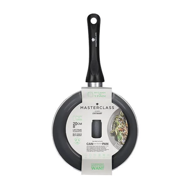 The MasterClass recycled non-stick 20cm frying pan is formed from 70% recycled aluminium drink cans for a greener solution. The frying pan is ideal for everyday home cooked dishes like curries, stir-frys, vegetables and meats.