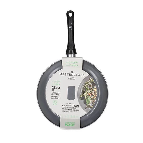 The MasterClass recycled non-stick 28cm frying pan is formed from 70% recycled aluminium drink cans for a greener solution. The frying pan is ideal for everyday home cooked dishes like curries, stir-frys, vegetables and meats.