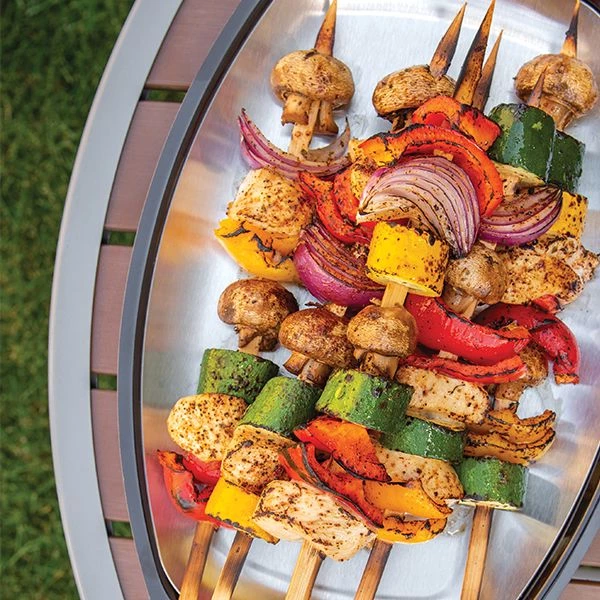 Place the stainless platter on top of your barbecue lid (or for sizzling results, directly on the grill grates) as your food nears completion. When you’re ready to take the food off of the barbecue, slide the heated tray into the insulated base and transfer food from the barbecue.