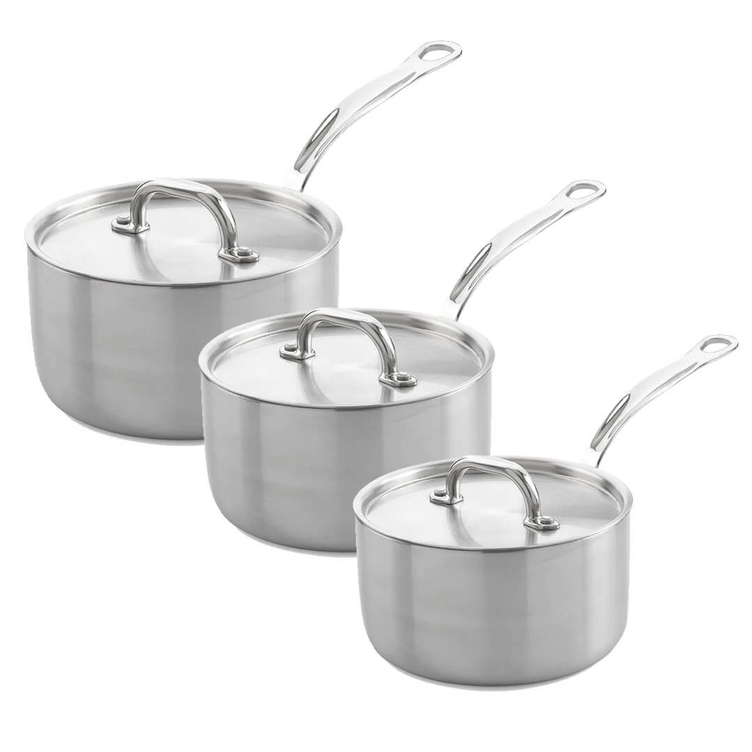 This Samuel Groves classic triply saucepans with matching lids are constructed with high quality stainless steel with an aluminum core which promotes quick and even heat distribution. These saucepan are ideal for cooking vegetables, sauces and soups at home.