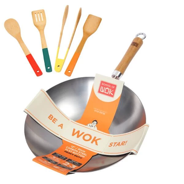 The School of Wok 12 inches / 30cm carbon steel heavy duty wok features a heavy gauge 1.8mm thickness. Perfect for fast heating and cooking like stir frys and flash frying at home. The heavy duty carbon steel wok can be used on all hob types including induction.