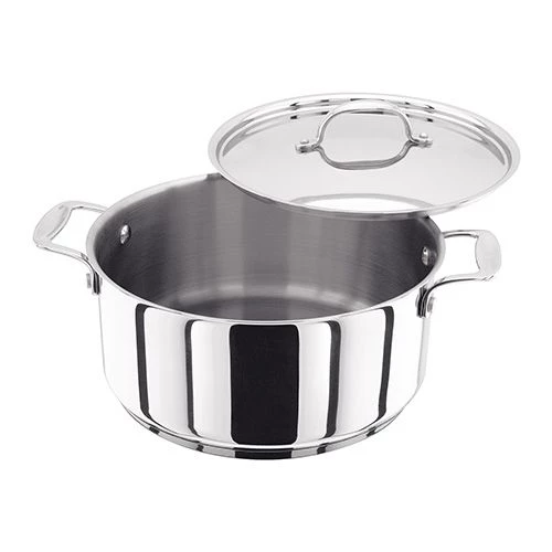 The Stellar 7000 24cm casserole is both elegantly stylish and efficient with hot-forged base to ensure even heat distribution on all types of hobs including induction. Crafted from mirror polished 18/10 stainless steel which allows for versatile cooking from hob to oven – up to 210°C. Featuring time saving internal measuring guides. 3.7L Capacity (H)14cm (W)26cm (L)33cm Stellar lifetime pan guarantee, with a 10 year non-stick guarantee
