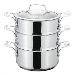 Stellar Premium 3 Tier 22cm Steamer Set has 4 interchangeable pieces in any configuration – 2 steaming tiers, base pan and a vented glass lid. This steamer is suitable for ALL hob types including induction and has efficient thermic bases for even heat distribution. Premium stainless steel with branded cast stainless steel handle and vented glass lids prevent from over boiling Dishwasher and oven safe 240°C Stellar lifetime pan guarantee