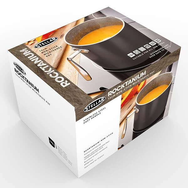 Perfect for creating sauces, making porridge or simply warming up baked beans, this 14cm Non-Stick Milk/Sauce Pot is part of the popular Stellar Rocktanium range. It’s great for healthy eating too as little to no oil is required thanks to its hardwearing PFOA free QuanTanium non-stick coating which also provides excellent scratch resistance and is harder and more durable than regular non-stick.
