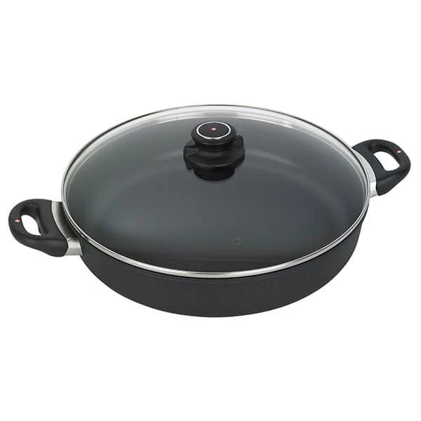 The Swiss Diamond XD Induction 4.2L 32cm Sauteuse With Lid has ergonomically designed handles that are securely attached without rivets to prevent bacteria build up. Supplied with a heat-tempered glass lid, this sauteuse is ideal for pot roast and other braised meats as well as baking casseroles. Complete with the Swiss Diamond patented coating, which is embedded with real diamond crystals to create a naturally non-stick surface that washes clean with just hot soapy water. Cooking depth approximately 2.36 inches. Dishwasher safe but hand washing is recommended.