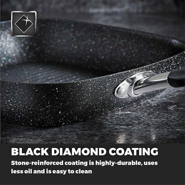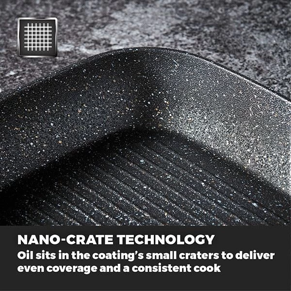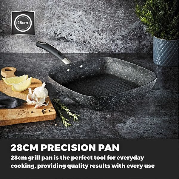 The Tower Precision 28cm grill pan is forged with an aluminium body for faster heat distribution and an ultra strong non-stick PFOA free black diamond coating which is safe for use with all utensil types. The cooking surface of the grill pan features rippled lines which is great for charing meat and fish for added texture and flavour.