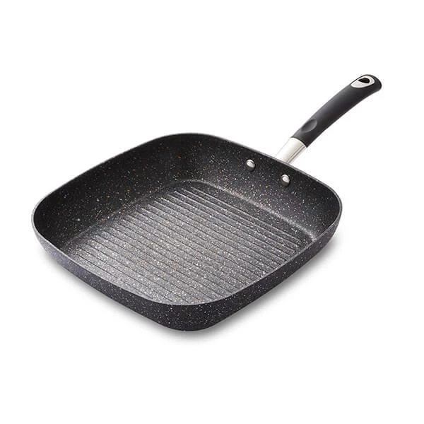 The handle of the 28cm grill pan is riveted steel with a silicone stay cool grip, comfortable to hold when in use and includes a hanging loop so that it can be hung easily on a rack.