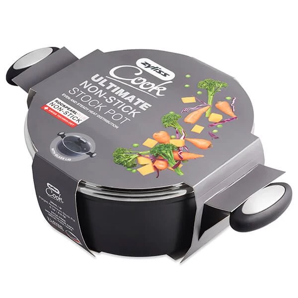 The Zyliss cook 24cm non-stick stock pot with helper handle features a swiss engineered PFOA non-stick coating reducing the need for oils and butters. The surface is hard wearing and safe for use with metal tools and the saucepan includes a glass lid so progress can be viewed without losing heat.